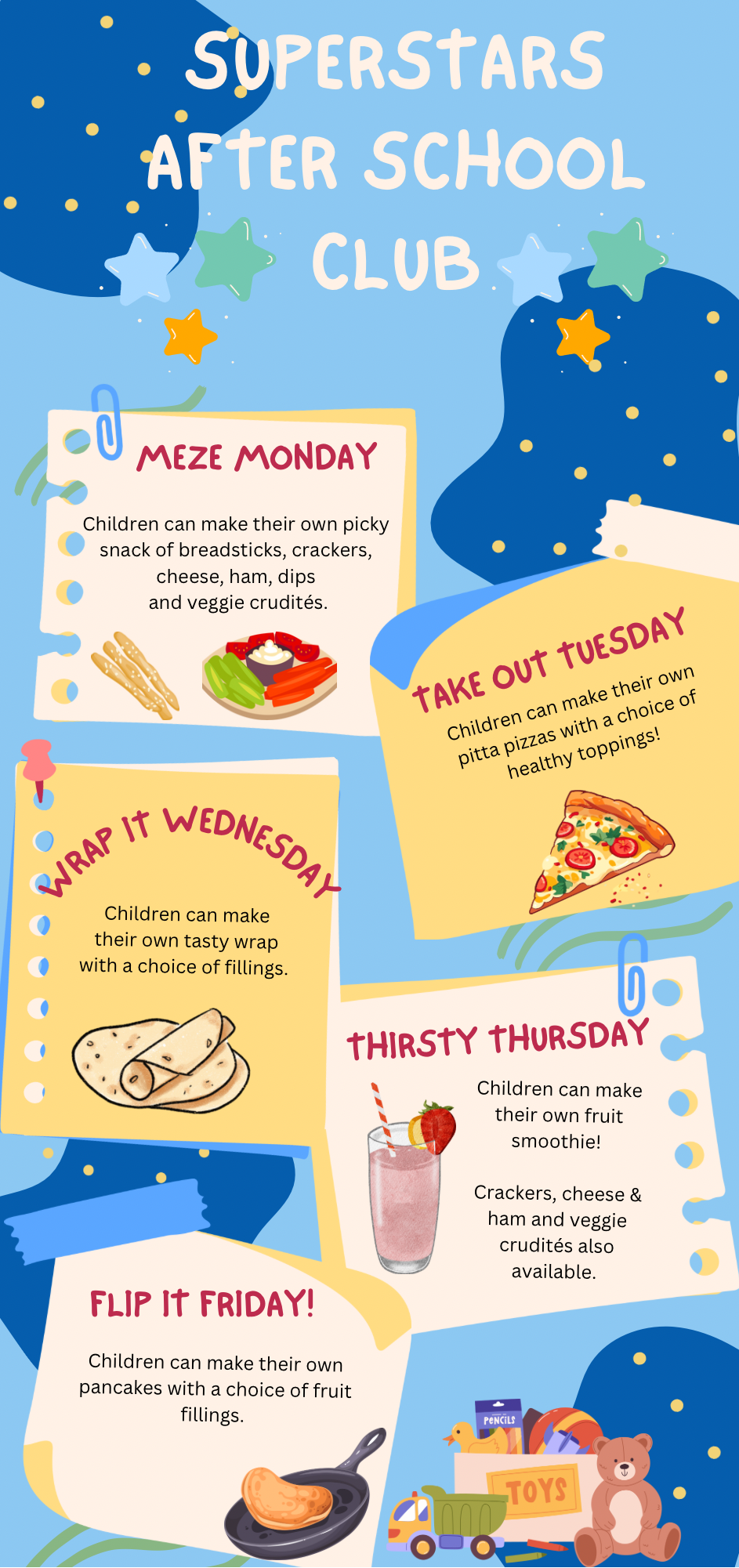 Our wrap around childcare is run by our own St. Mary's Staff in their own dedicated space. Children will be served breakfast in our 'Early Birds Breakfast Club', and a light tea in our 'Superstars After School Club'.